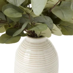 Green Artificial Eucalyptus Arrangement In Cream Stripe Ceramic Vase