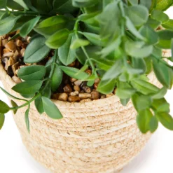 Green Artificial Leafy Plant Arrangement With Brown Woven Pot