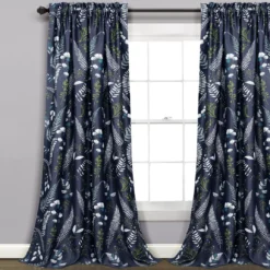 Devonia Allover Navy & Green Floral Room-Darkening Rod Pocket Curtain Panel Pair, (84″)