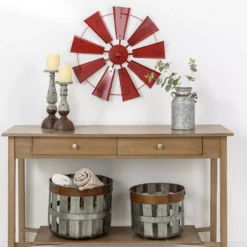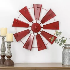 For a pop of color, this hanging windmill wheel is designed in rustic style and aged patina to give your walls a farmhouse look. Put this on display in your home for an eclectic, countryside look in your living room, entryway or dining area. The open concept structure will add dimension and texture to any wall.