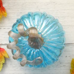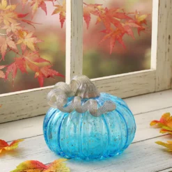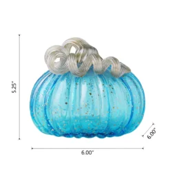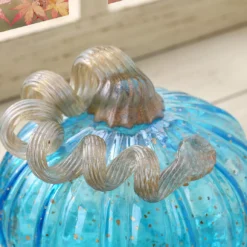 Bring stunning seasonal design to your home using this lovely glass pumpkin. The classic ribbed sides are beautifully colored in a blue hue and features speckles of gold. Complete with a textured curled stem on top, it’s a wonderful addition to a mantel, table or shelf.