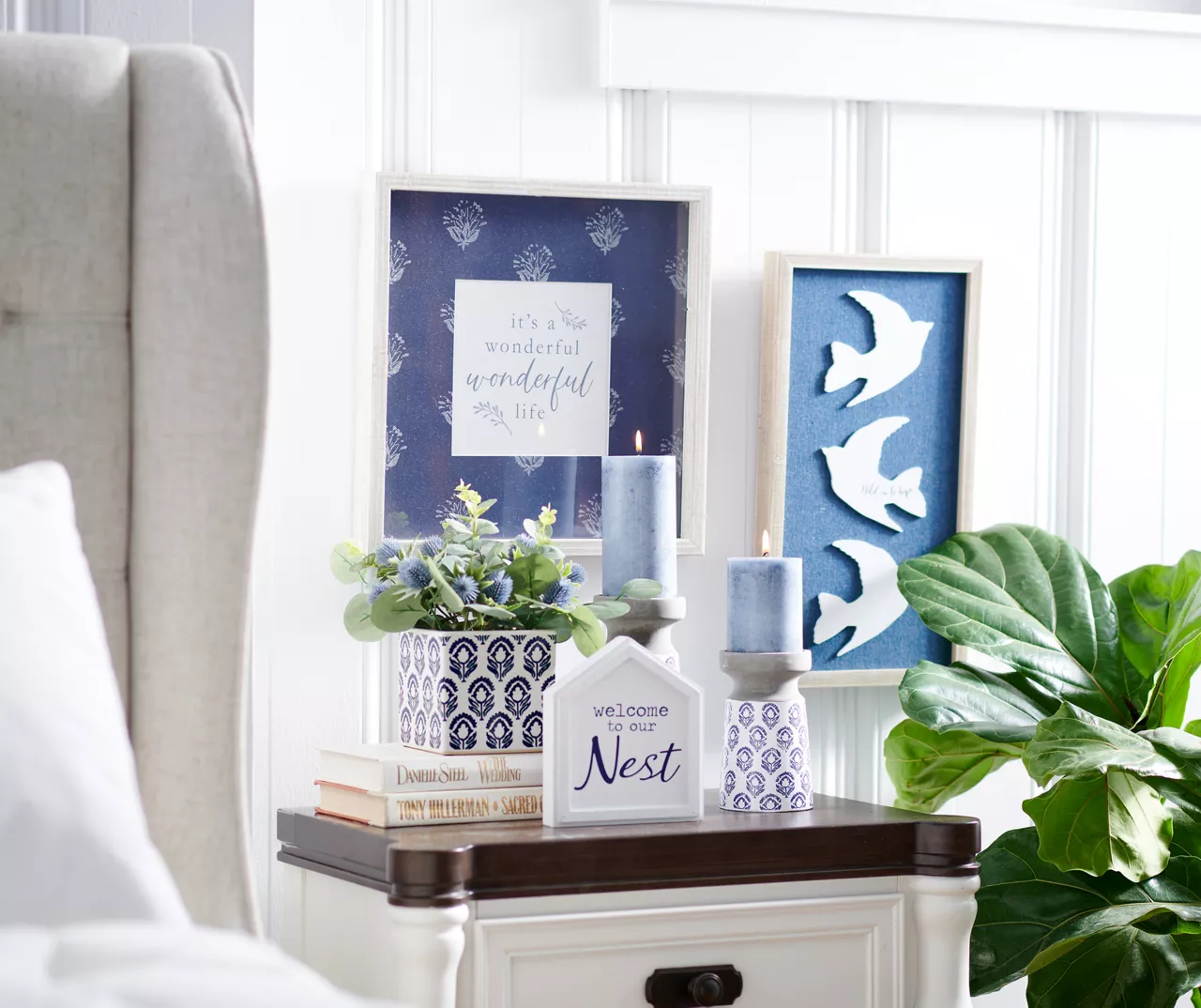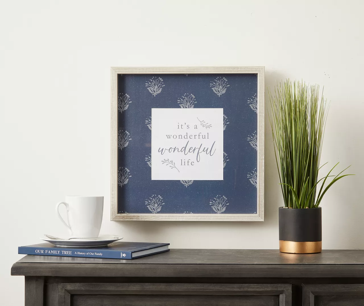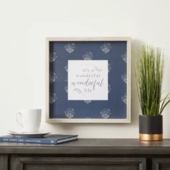 This farmhouse framed plaque features stylized typography that’s surrounded by a white floral stencil against a blue background. Hang it in your bathroom, living room or entry way to extend a country chic aesthetic and warmth in your home.