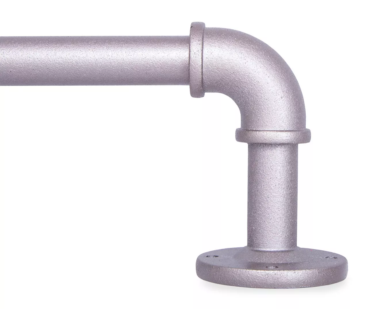 - Steel industrial designed wrap around curtain rod in pewter textured finish with matching hardware