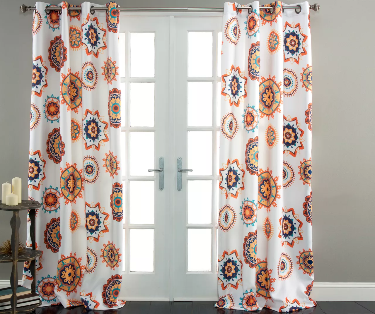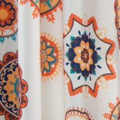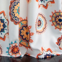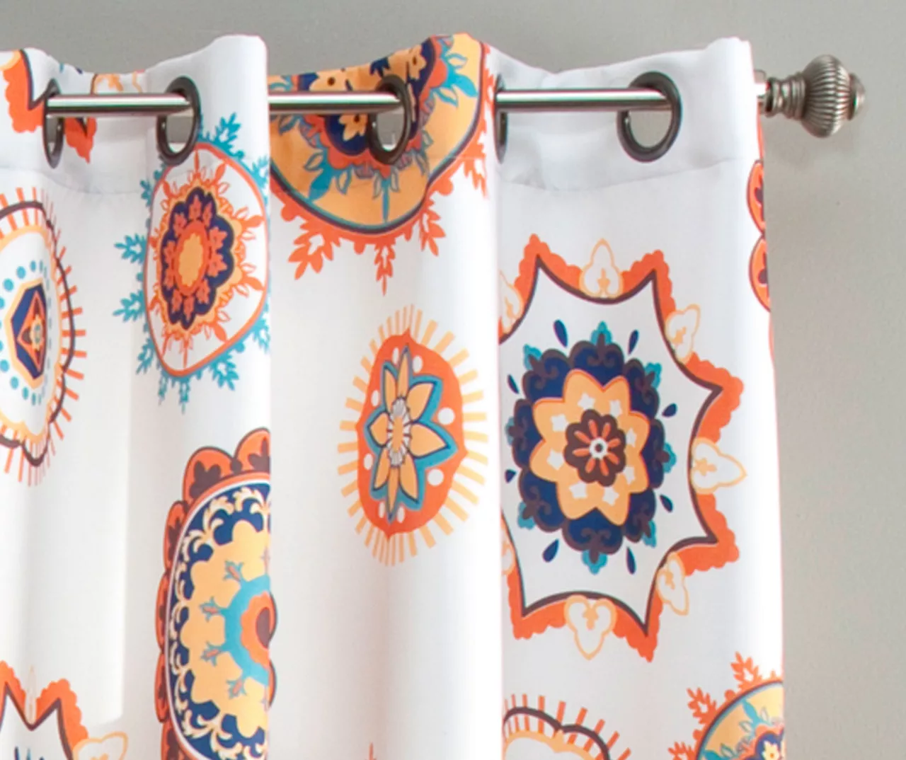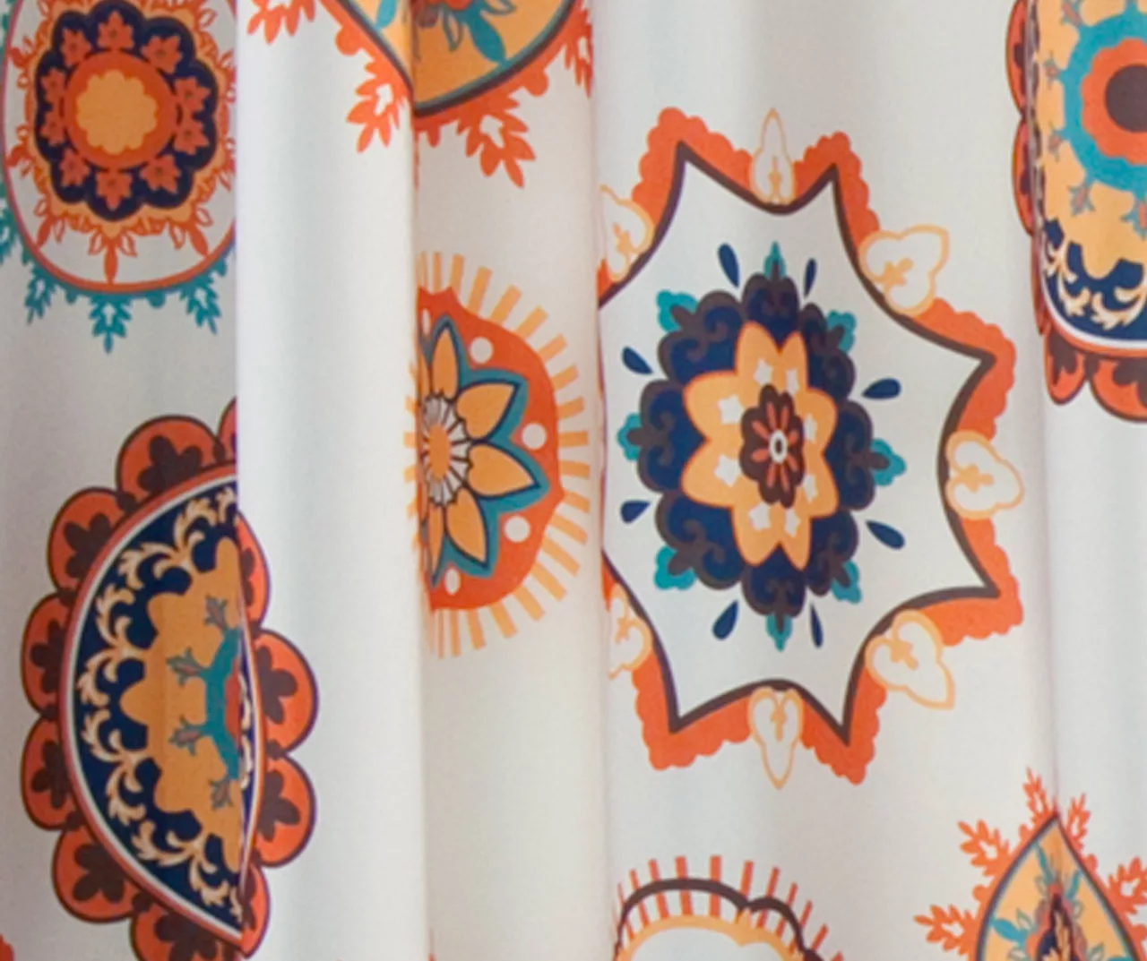 - Beautiful floral medallion print in vibrant orange, blue and aqua against a white background