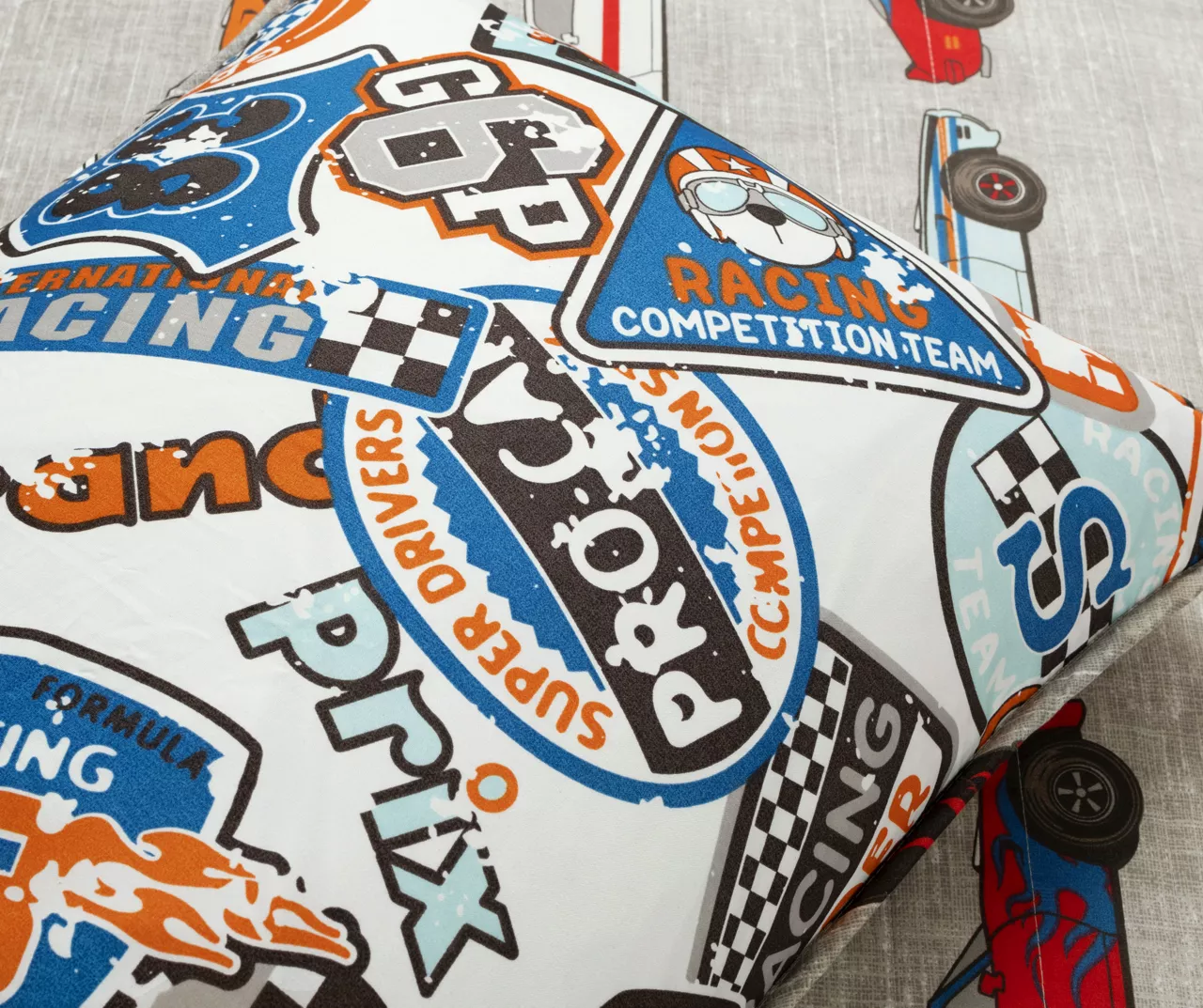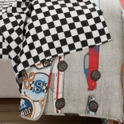 - Quilt front features a race car motif and reverse side features a checkerboard pattern