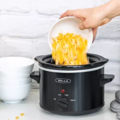 Smaller meals are made easy with the Bella 1.5-quart slow cooker. Convenient three temperature control settings adapt to your needs for preparing smaller entrees or keeping appetizers warm to serve such as queso, spinach dip or a personal size chili. The warm setting will keep the heat before you serve directly from the removable stoneware pot. Cool touch side handles and knobs for safe handling, cooking and serving with ease. Dishwasher safe stoneware pot and tempered glass lid offers fast and easy clean up.