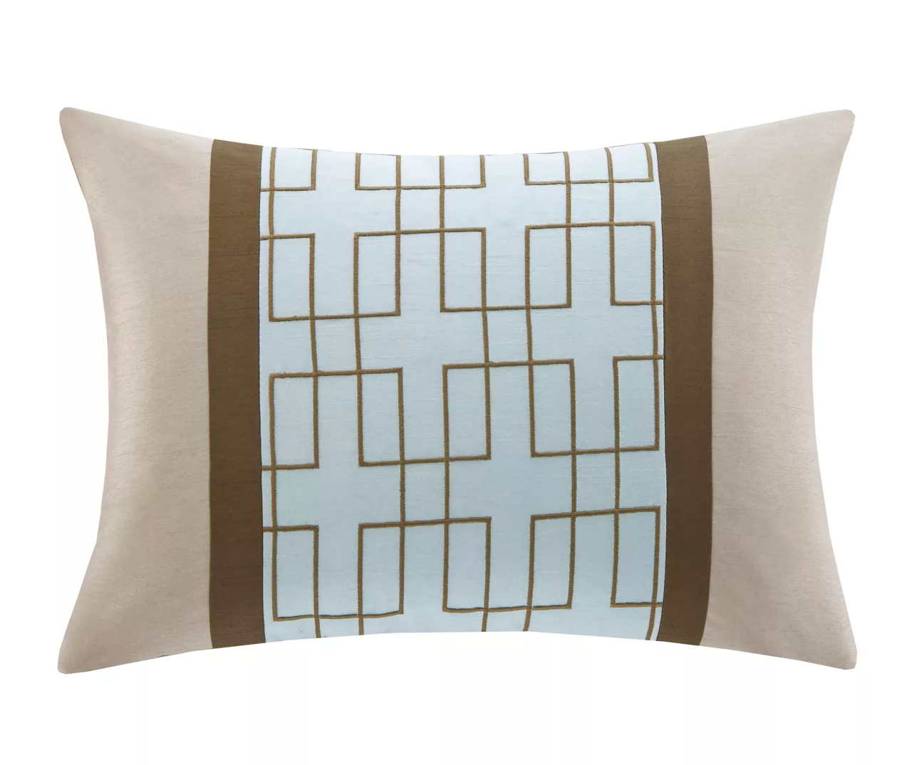 - Includes comforter, bed skirt, 2 shams, 1 square pillow, 1 oblong pillow and 1 neckroll pillow