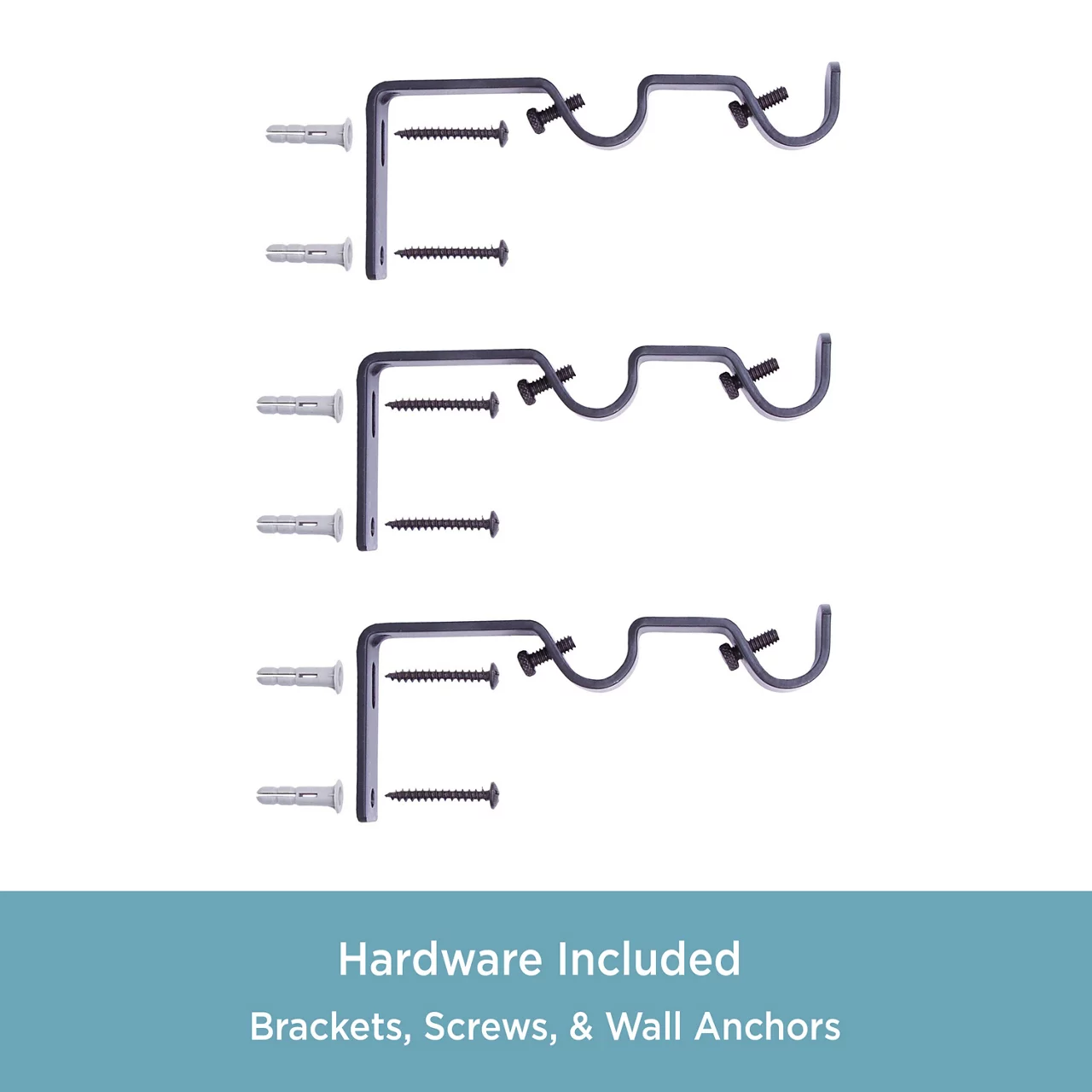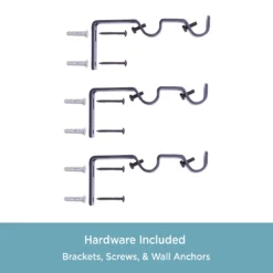 - Includes one telescoping steel back curtain rod, two double rod mounting brackets, one center support, screws, drywall anchors and instructions