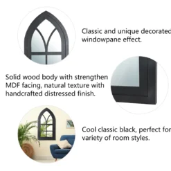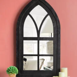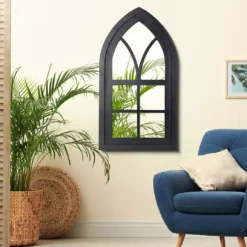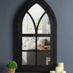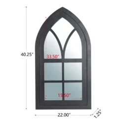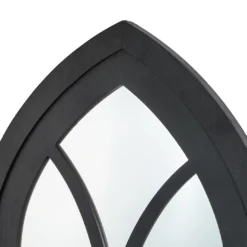 Flaunting a pointed arch frame with windowpane detailing in the center, this decorative mirror refreshes your room with modern architectural style that makes a statement, while providing a feeling of extra space and depth. Hook loops in the back make installation quick and easy.