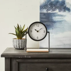 Keep the time while accenting your home with the quirky charm of this tabletop clock elevated by black metal rods on a brown wood base.
