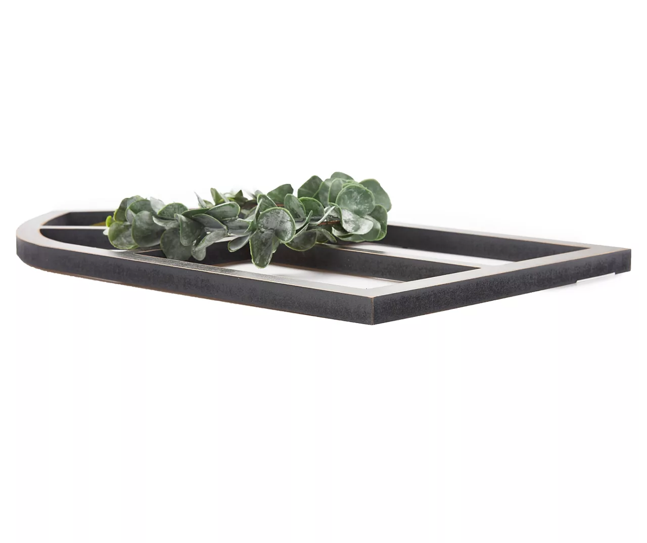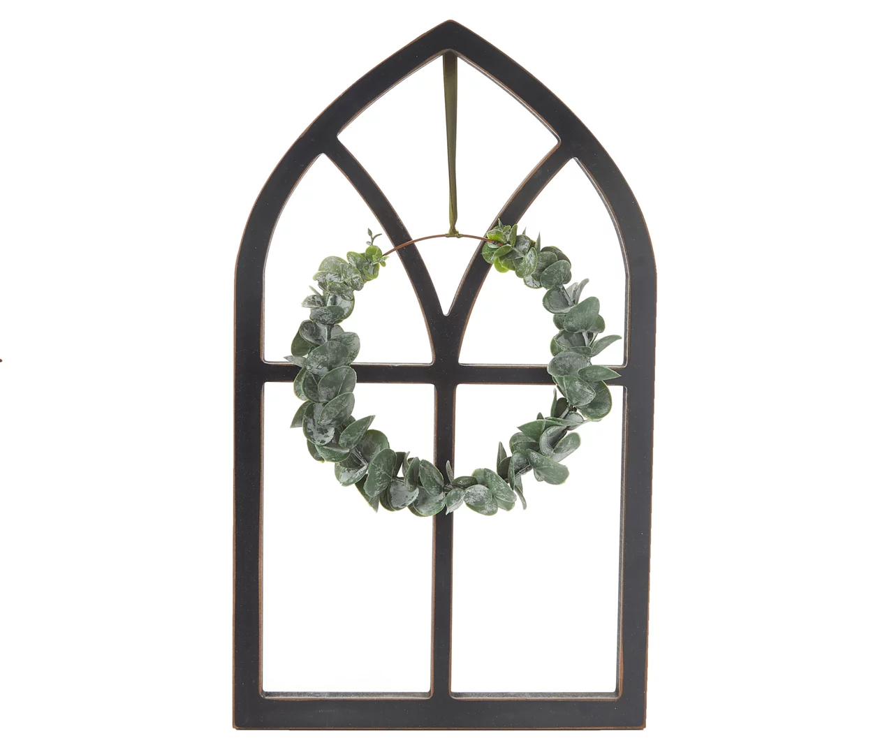 Bring an architectural element to your living space with this decorative arch in black that’s pointed at the top and adorned with a hanging green, leafy wreath. A sawtooth hanger in the back makes installation quick and easy.