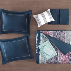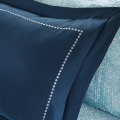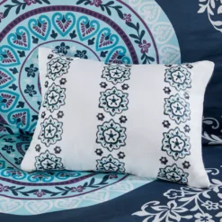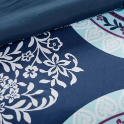 The Blaire comforter set brings bright, free-spirited elegance to your bedroom. A large medallion print runs down the center of the comforter with subtle bohemian details highlighted. Coordinating shams with embroidered borders complement the comforter. A decorative pillow with ruched and embroidered detailing and a solid navy bed skirt finish the look.
