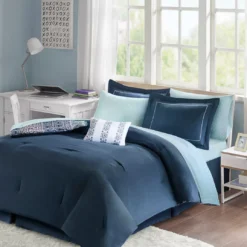- Includes comforter, bed skirt, 2 shams, 1 oblong pillow, flat sheet, fitted sheet, bed skirt, and 2 pillowcases
