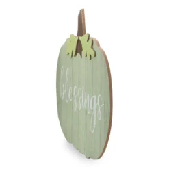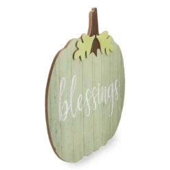 Let your love for autumn and everything it brings shine with this unique wall décor. It features a light green wooden pumpkin complete with stem and leaves and a white script across the center with the phrase “Blessings”. This will be sure to let everyone know how much you enjoy the crisp fall air.