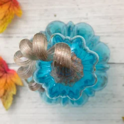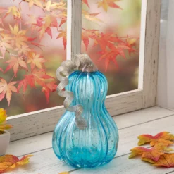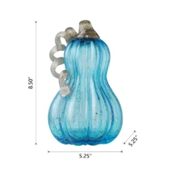 This decorative gourd creates an interest and festive look among your autumn decorations. The curvy shaped body with classic ribbed sides is beautifully colored in a blue hue and features speckles of gold. Complete with a textured curled stem on top, it’s a wonderful addition to a mantel, table or shelf.