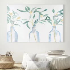 A painted botanical design is shaped by gentle strokes in soothing shades of green and blue with hints of yellow on gallery-wrapped canvas for a creative note of nature in your home. Gouache-style texturing adds a dimensional visual element that makes this pretty pick pop wherever you choose to place it.