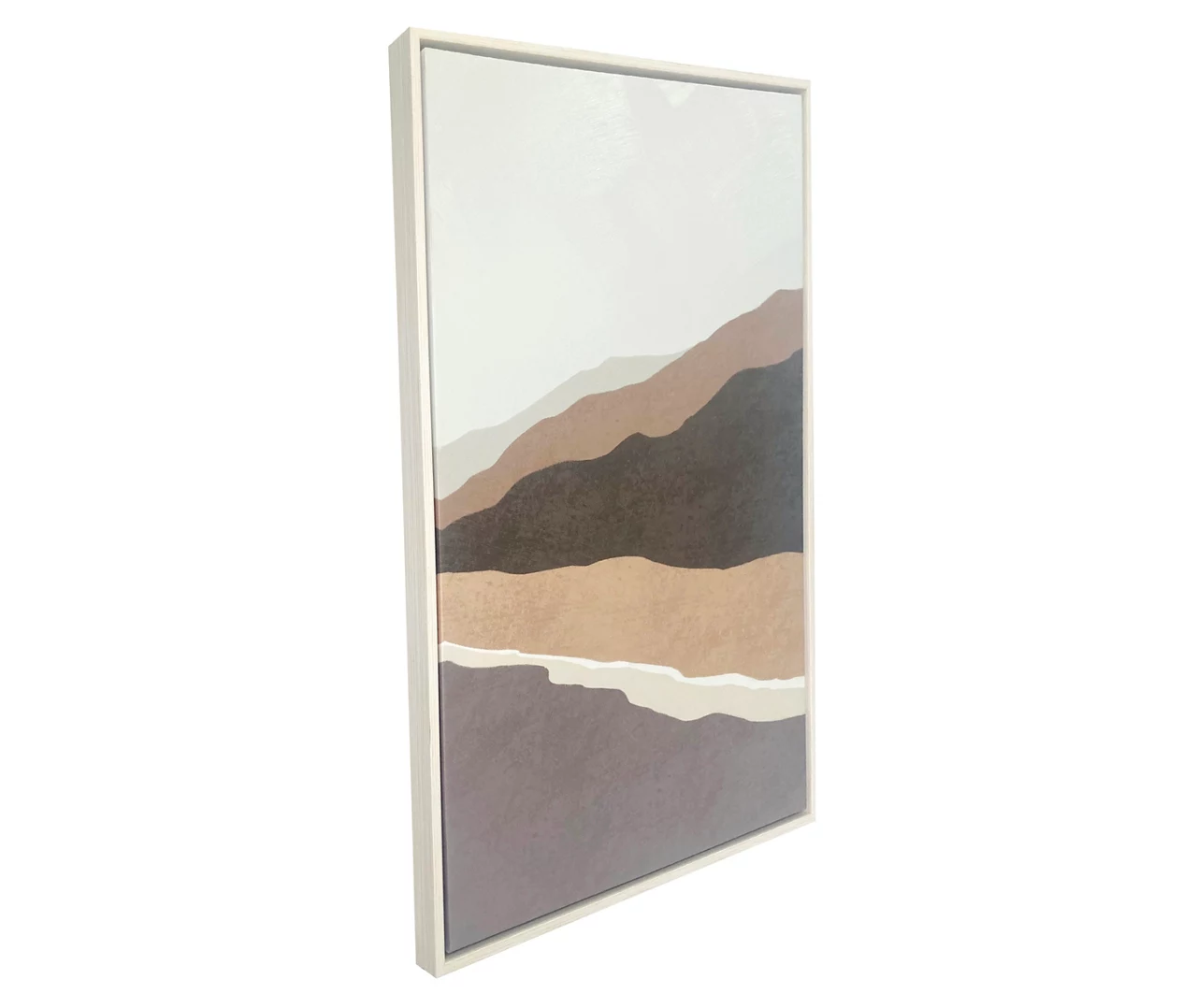 Elevate your living space with this contemporary take on a landscape scene. This lovely wrapped canvas features a mountain range in a neutral color palette that easily blends in with your décor, and a slender frame completes the look with sleek modern polish.