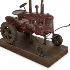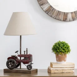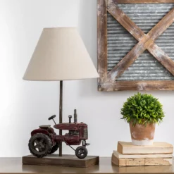 With a vintage tractor design, distressed finish and soft beige fabric shade, this statement-making lamp brings farm-fresh charm and warm illumination to your interior spaces.