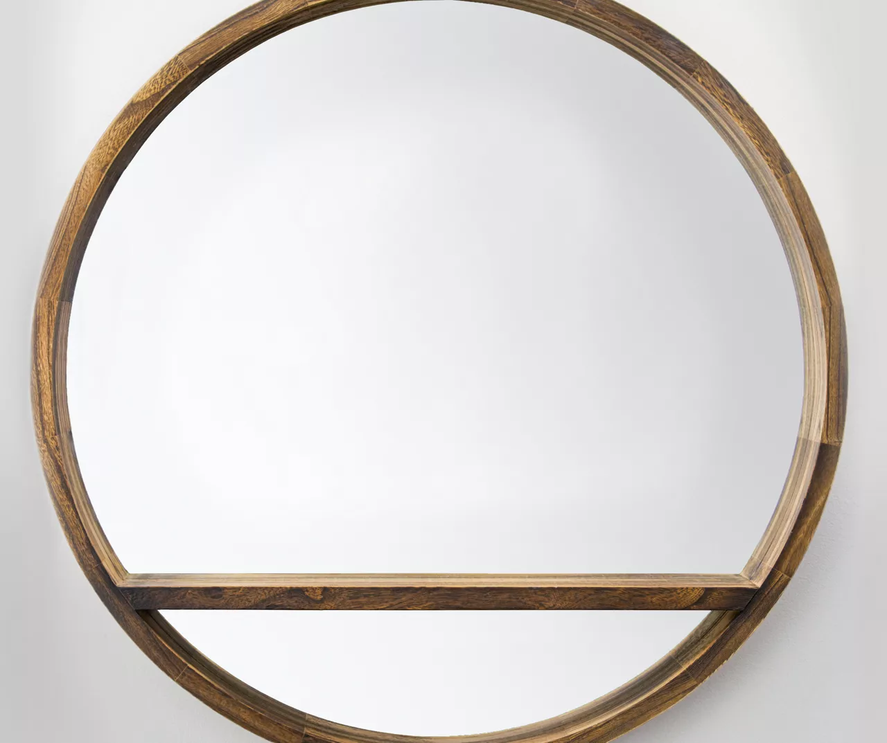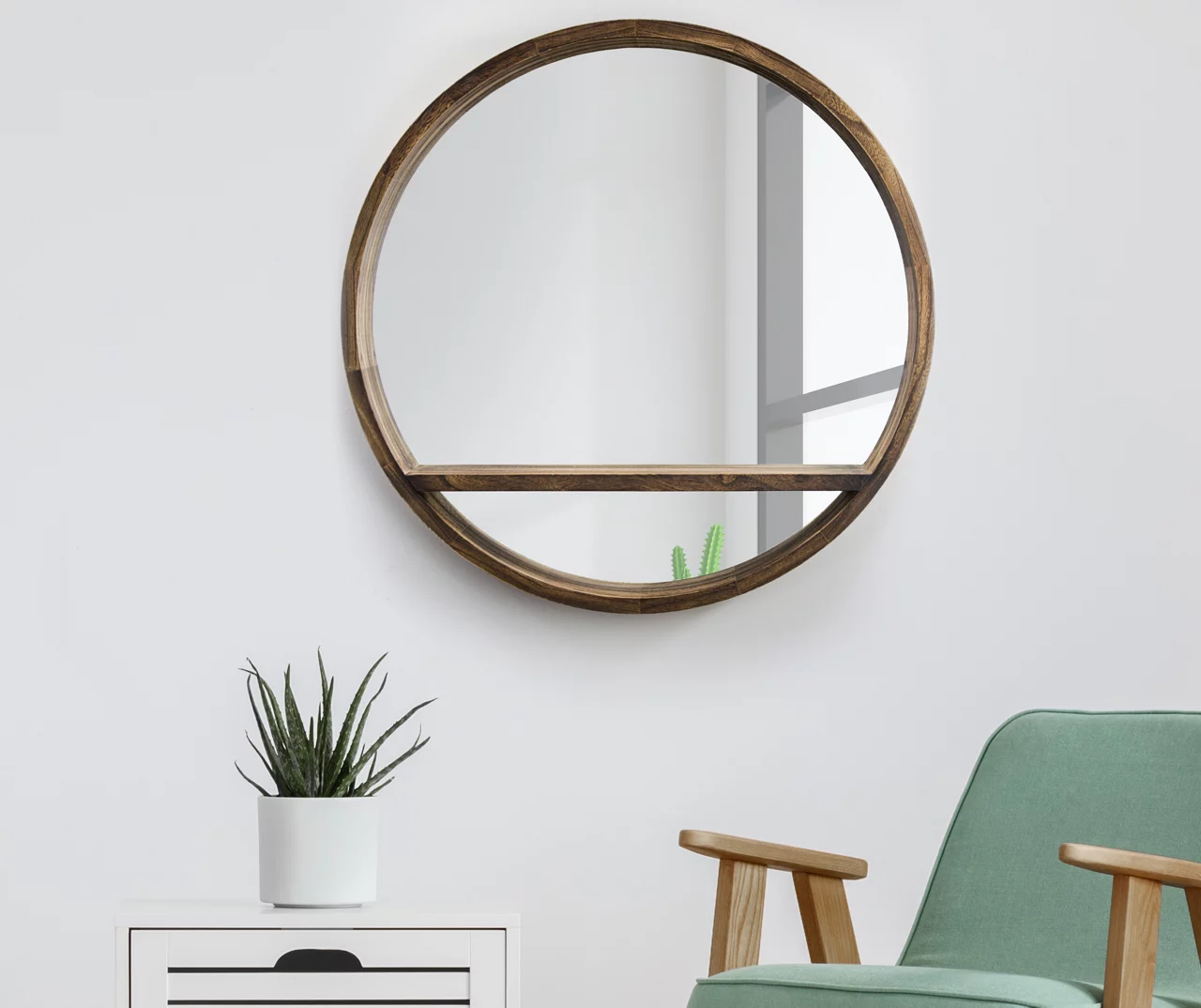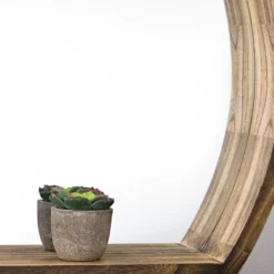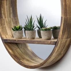 This beautiful wooden wall mirror also serves as a storage shelf for small items such as mementos, figurines and photos. Made from real wood that has a natural brown wood stain, this wall mirror with shelf is a wonderful way to open up a small living room or bathroom, or place it opposite a window to cast diffused light with a cozy and rustic look. It looks wonderful in a bedroom, bathroom, living room or dining room, commanding attention and pulling focus.