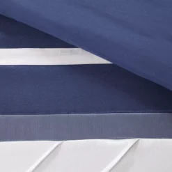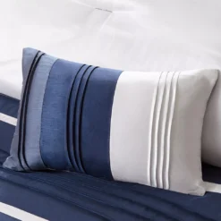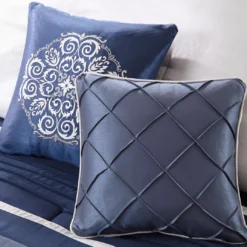 The Burnett comforter set offers a rich traditional update to your bedroom decor. The comforter and matching shams feature lustrous fabric and pintuck details in navy, dusty blue and gray hues to create a stunning traditional look. Two square pillows and an oblong pillow with embroidered and pintucked details add rich textural touches to the top of the bed. A solid black bed skirt provides the finishing to the luxurious comforter set. Hypoallergenic filling in the comforter and decorative pillows provides exceptional warmth and comfort. Great for year-round use, this set brings a gorgeous and sophisticated look to your bedroom and is machine washable for easy care.