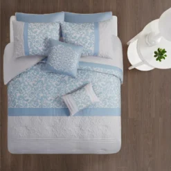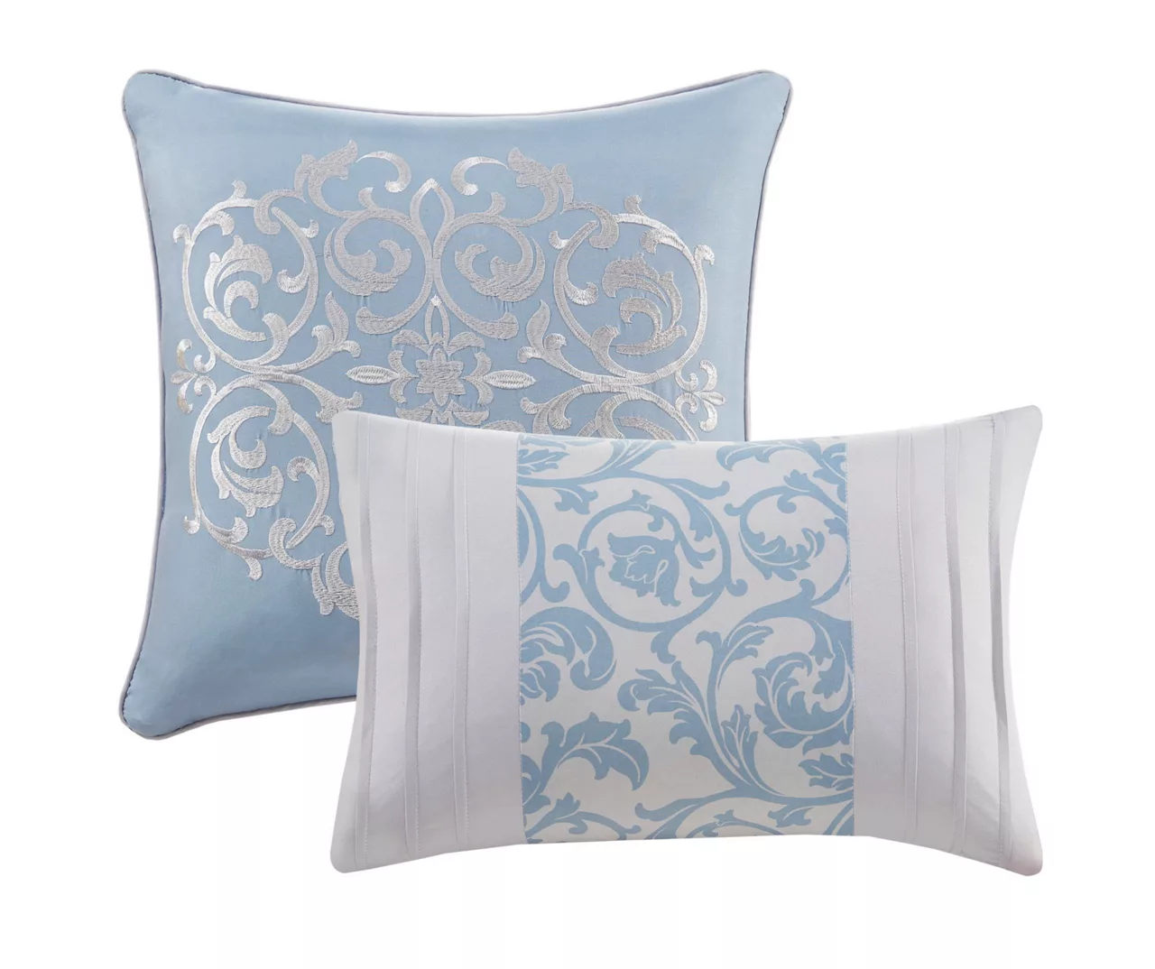- Includes comforter, bed skirt, 2 standard shams, 2 euro shams and 2 decorative pillows