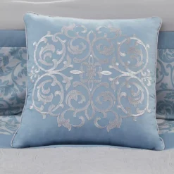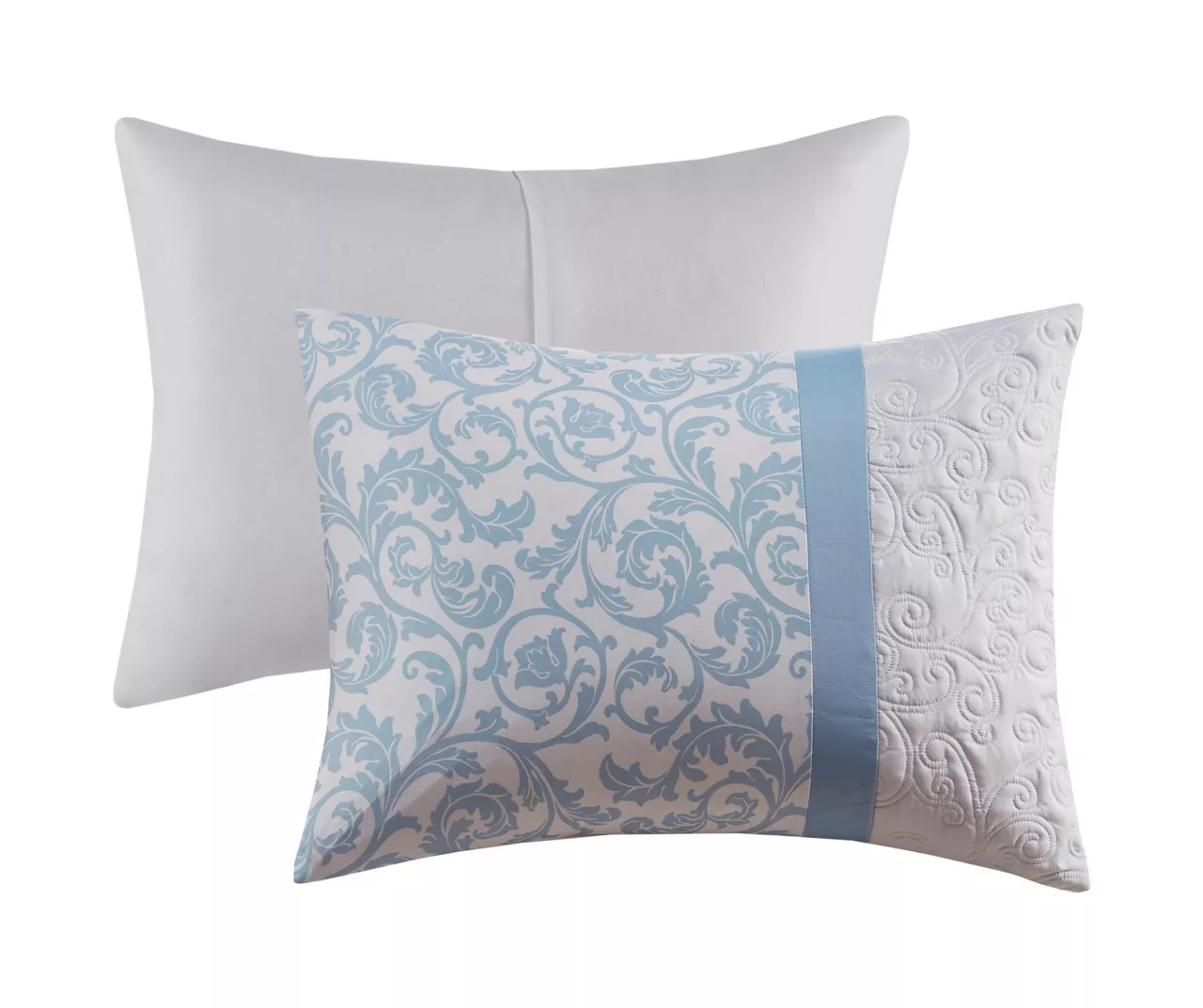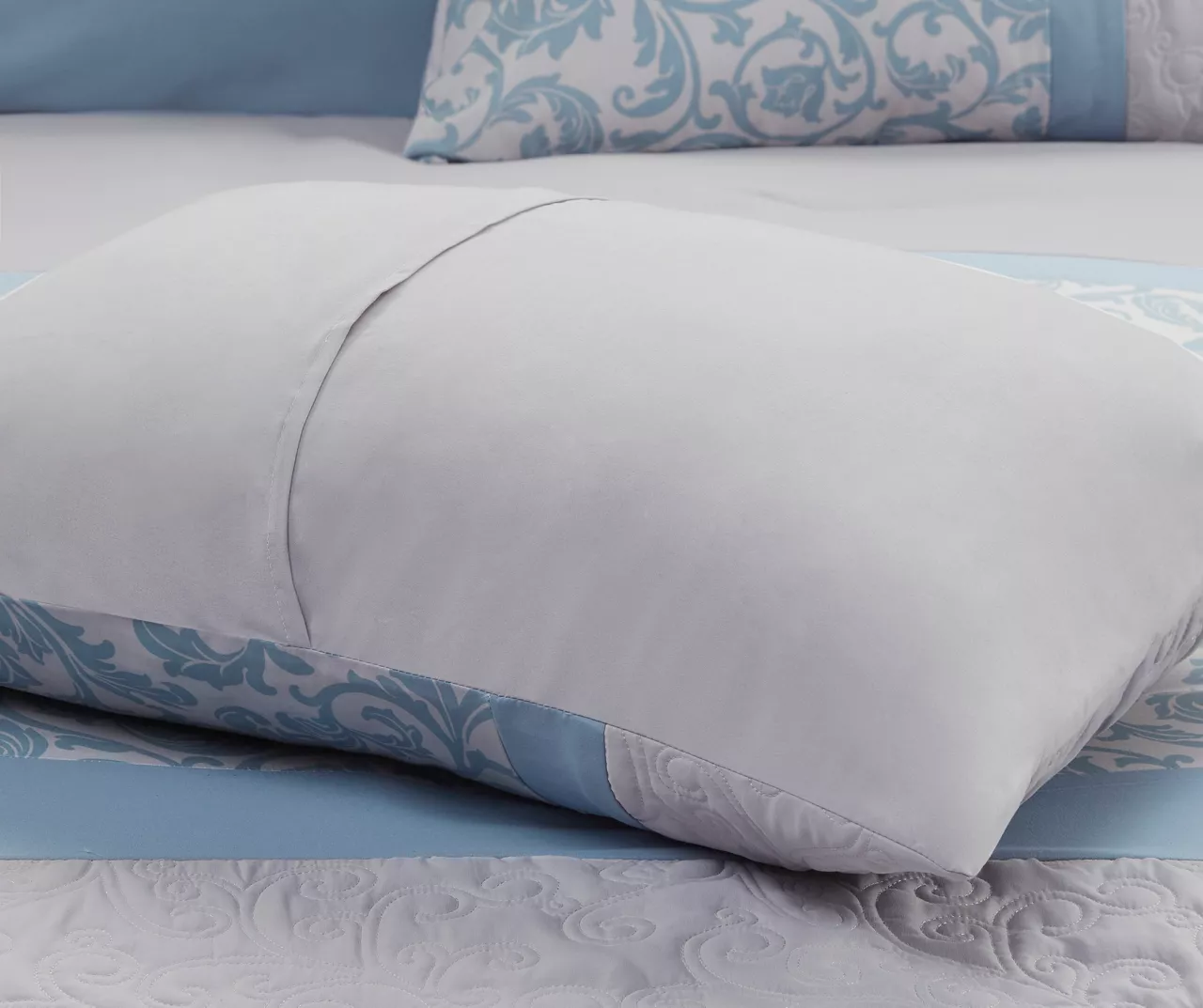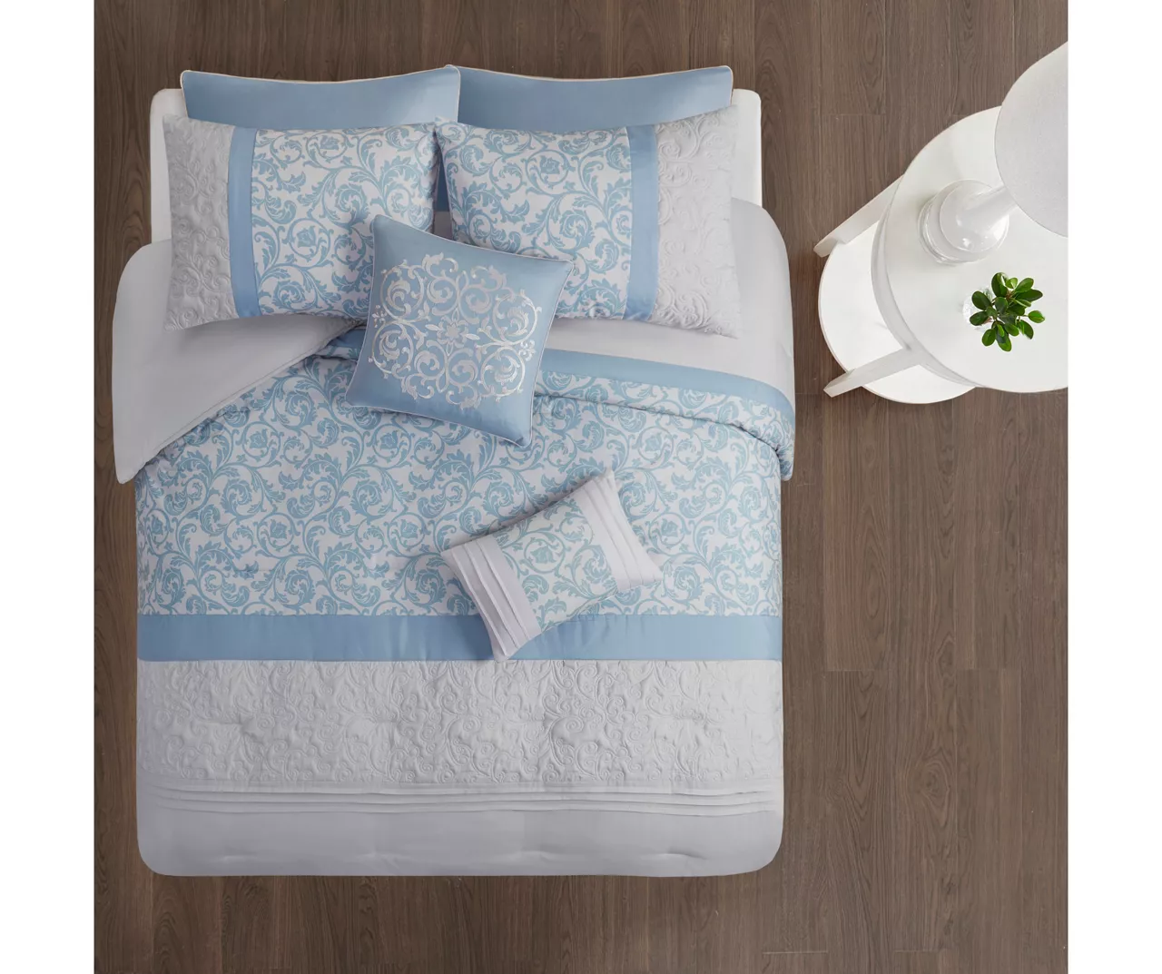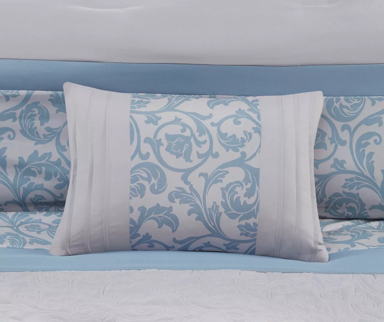 The Casey comforter set features an embroidered damask design with quilted and pintuck details adorns the face of the comforter and shams for a beautiful, modern look. Solid Euro shams complement the top of the bed, while two embroidered decorative pillows and a solid bed skirt provide the perfect finishing touches to your bedroom makeover. Made from soft microfiber with a hypoallergenic fill, this comforter set wraps you in comfort through the night.