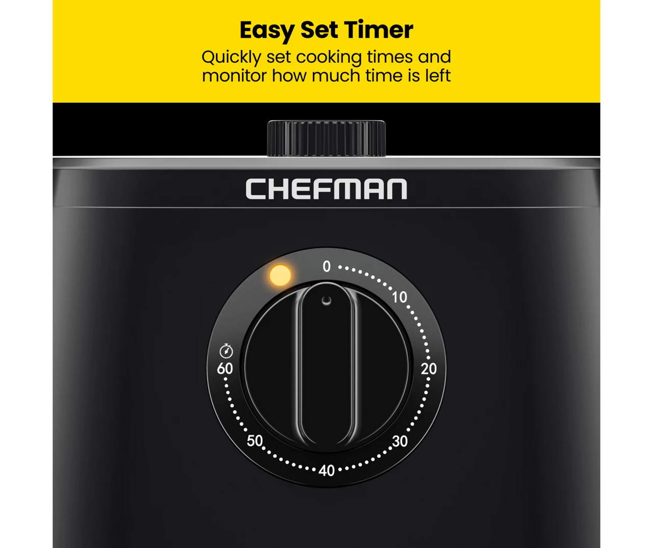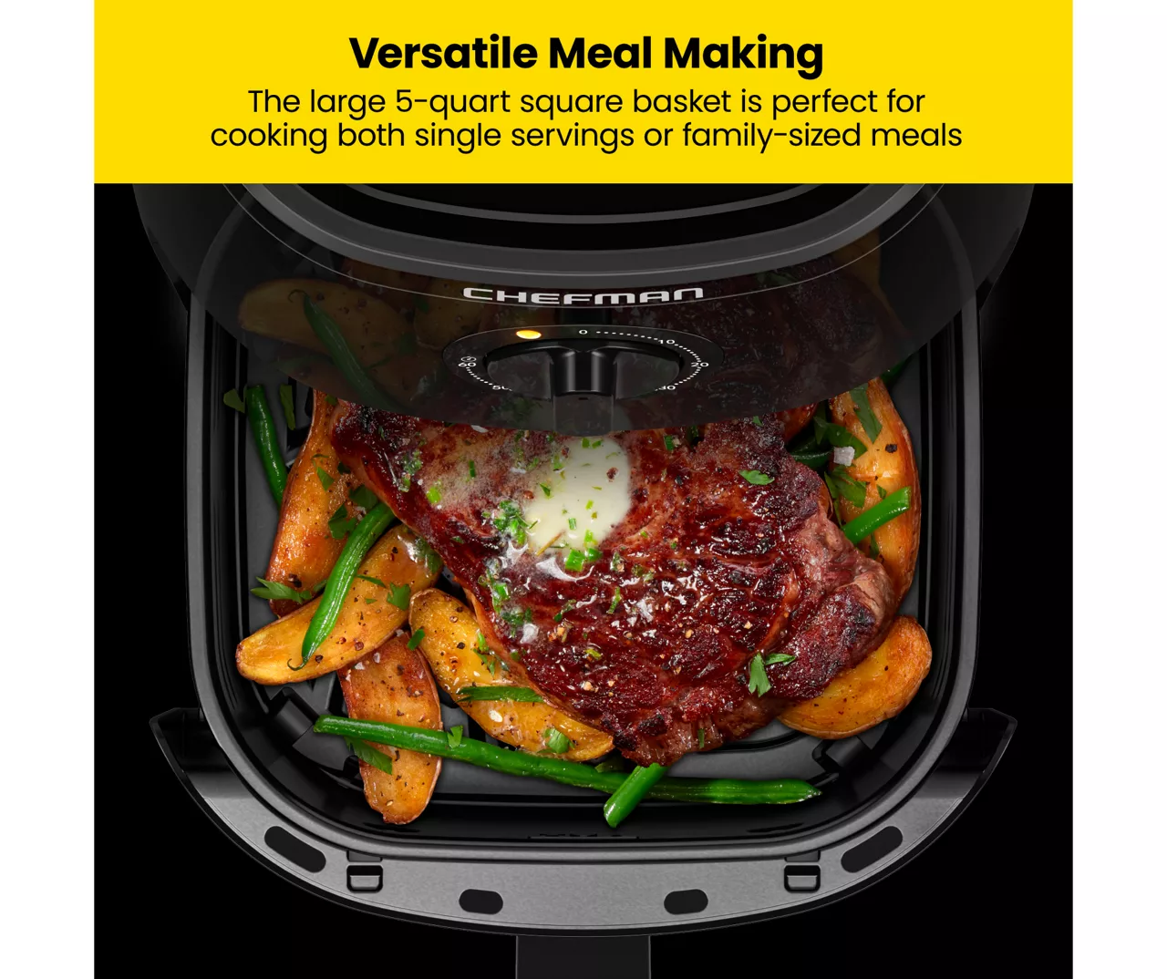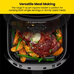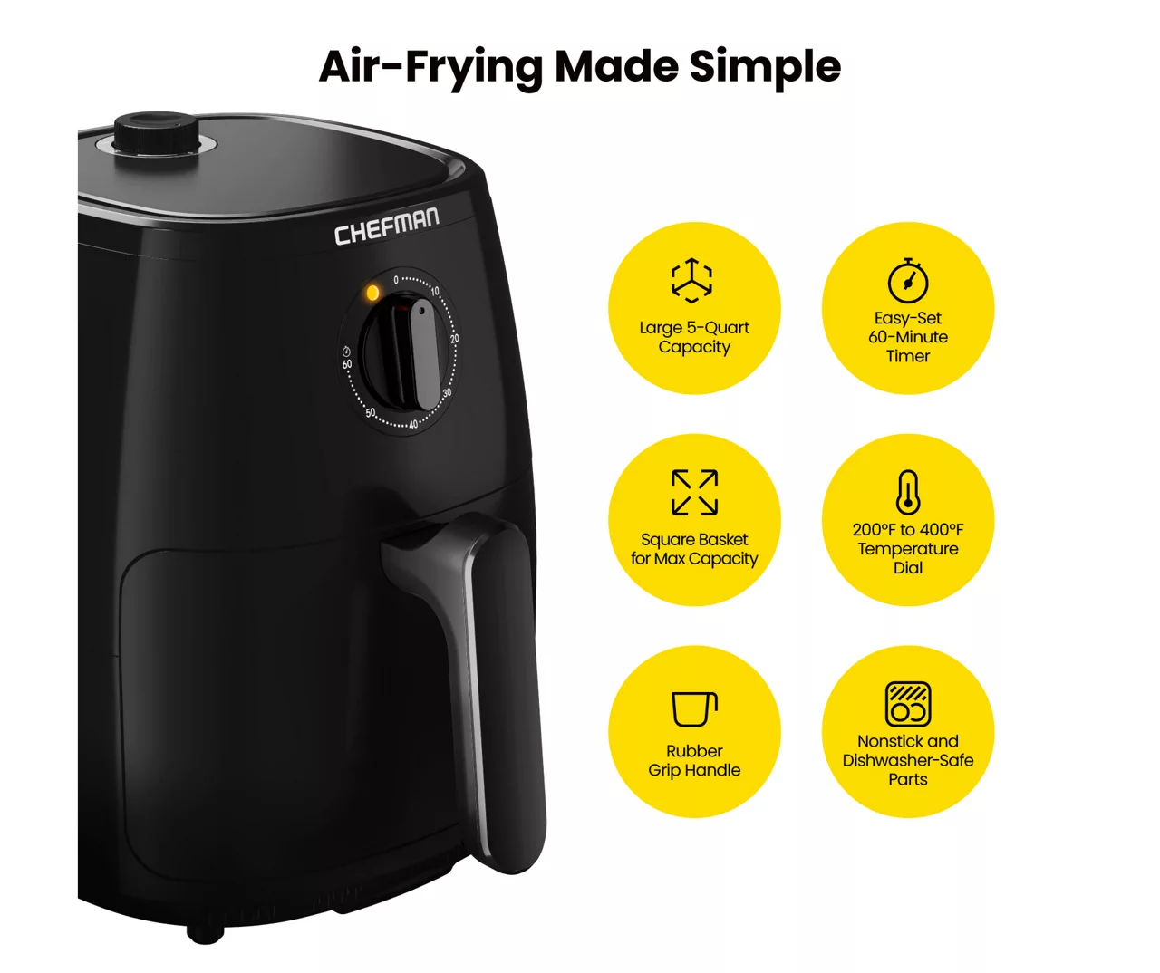 Air frying for the family is so convenient with the Chefman TurboFry 5 Quart Air Fryer. The easy-set 60-minute timer helps you cook your favorite foods to the perfect fried finish every time. An adjustable temperature range of 200°F to 400°F gives you complete control to customize your crisp preferences. The dishwasher-safe nonstick basket with five quart capacity allows you to feed the whole family, and the matte black exterior wipes down simply with a damp cloth.