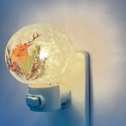 All is calm, all is bright decorating your home with this seasonal night light! A globe cover features a beautiful illustration of a deer walking through pine branches and snow. Featuring a simple on/off switch on the front, this night light is a charming addition to your holiday celebrations.