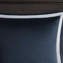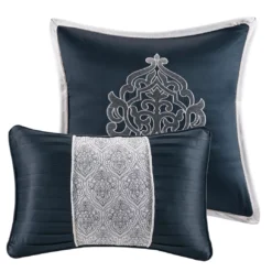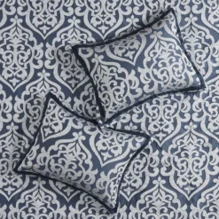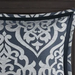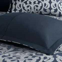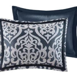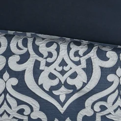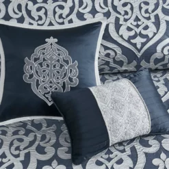 Add a touch of class to your bedroom with the Eliot comforter set. The luxurious textured jacquard comforter and shams flaunt a gorgeous damask medallion design with striation details on the satin ground that add dimension to the lavish look. A solid reverse and stunning Euro shams complement the top of the bed to complete the ensemble. Also included are two decorative pillows that feature embroidery and cording details, while a solid bed skirt provides a clean and elegant finish. Overfilled for superior warmth and comfort, this jacquard comforter set offers a strikingly luxurious update to your decor.