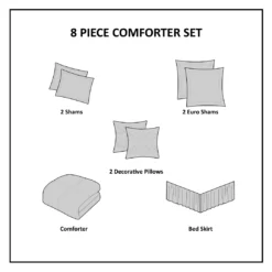 - Includes 1 comforter, 2 euro shams, 2 shams, 2 decorative pillows and 1 bed skirt