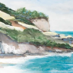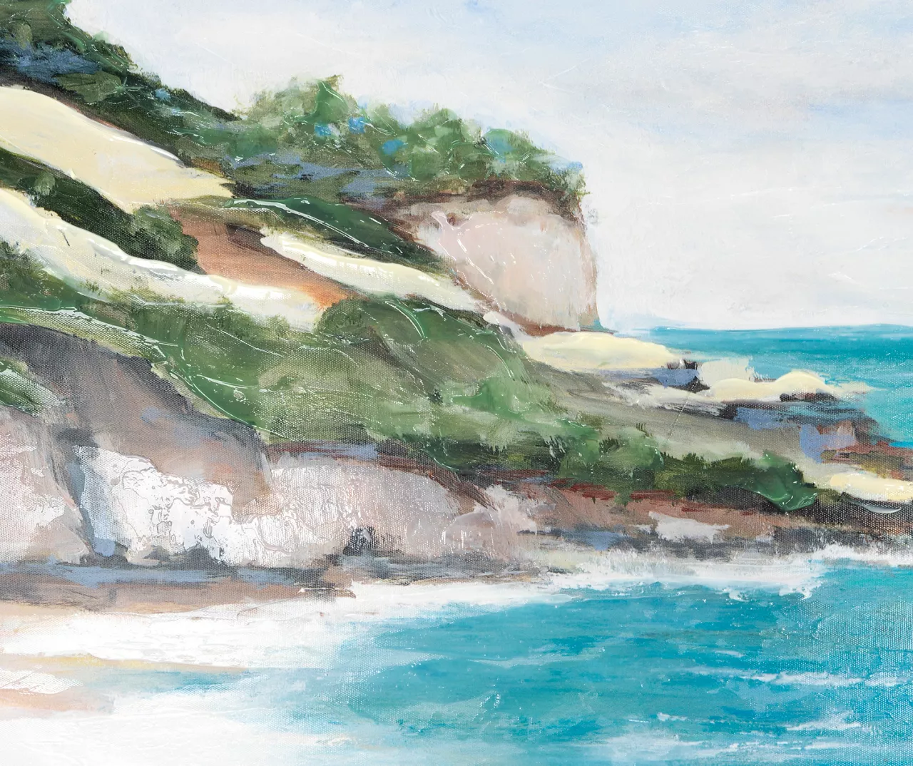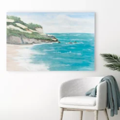 A painted coastal scene is shaped by gentle strokes in rich shades of blue, green and beige on gallery-wrapped canvas for a creative note of nature in your home. Gouache-style texturing adds a dimensional visual element that makes this pretty pick pop wherever you choose to place it.