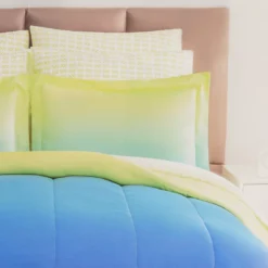 - Reversible comforter features a smooth ombre design on one side and bright stripes on the other