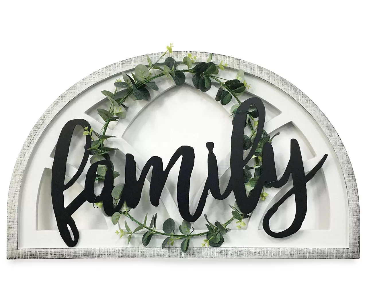 Channel farmhouse style while showing your love for family with this stunning wall décor. It combines a distressed arch, greenery wreath and script word overlay. Add it to a gallery wall or hang as a standalone piece in the living room, dining room or home office for eye-catching design.