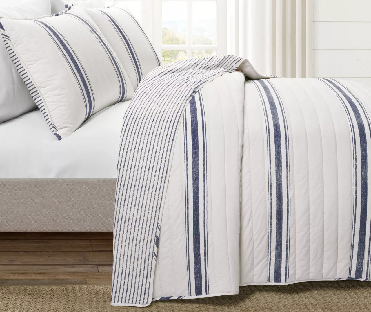 Crisp navy stripes define this white bedding set from Lush Decor with classic farmhouse appeal, and horizontal quilting finishes the look with textured charm. Matching shams complete the look, and the back side features tight navy stripes so you can switch up your bedroom style on a whim.