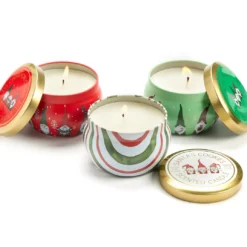 This gift set of candles brings charming seasonal icons and refreshing fragrances to anyone’s holiday. Decorated in stripes and gnomes, the tin holder candles feature classic Christmas scents of Fresh Balsam, Santa’s Cookies and Cinnamon Cheer. This multi-candle set comes pre-packaged and wrapped in a lovely red ribbon bow.
