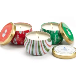 This gift set of candles brings charming seasonal icons and refreshing fragrances to anyone’s holiday. Decorated in stripes and snowmen, the tin holder candles feature classic Christmas scents of Fresh Balsam, Santa’s Cookies and Cinnamon Cheer. This multi-candle set comes pre-packaged and wrapped in a lovely red ribbon bow.