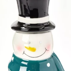 - Ceramic snowman dressed in black top hat with green scarf and mittens