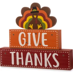 Celebrate the season of gratefulness displaying this charming décor. Two blocks in orange and red read “give thanks” in stylized letters as an adorable turkey sits on top with multi-colored feathers. Illuminating from lovely LED lights, it’s a wonderful seasonal addition to a mantel, table or shelf.