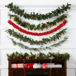 Add some shimmer to your holiday décor with this beautiful glitter pinecone garland. Drape across your mantel or accent a stairway with this festive green garland adorned with brown pinecones. It’s a statement piece that’s sure to be remembered.