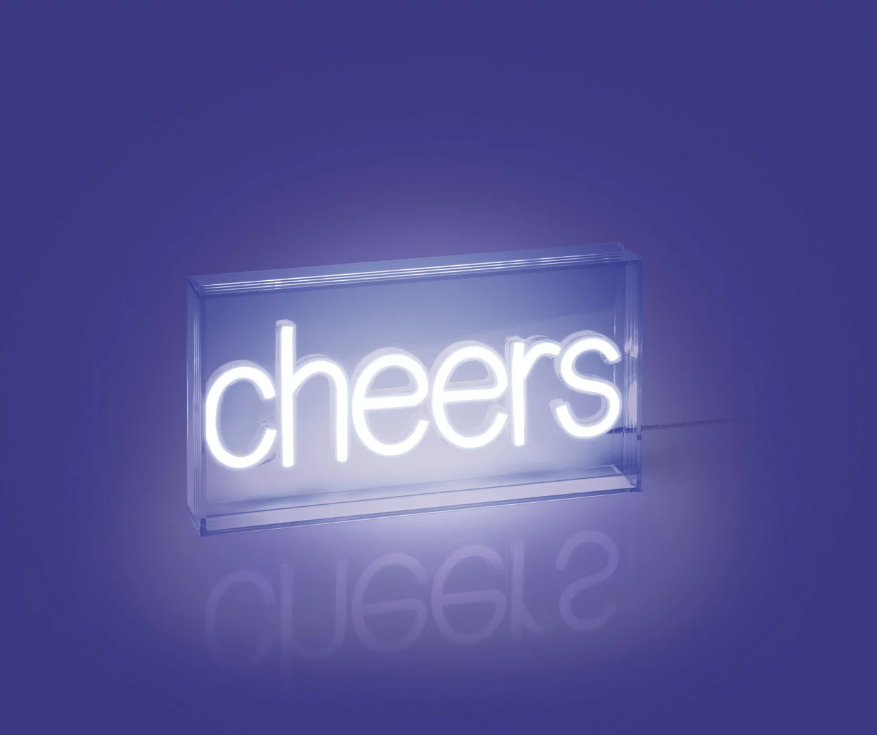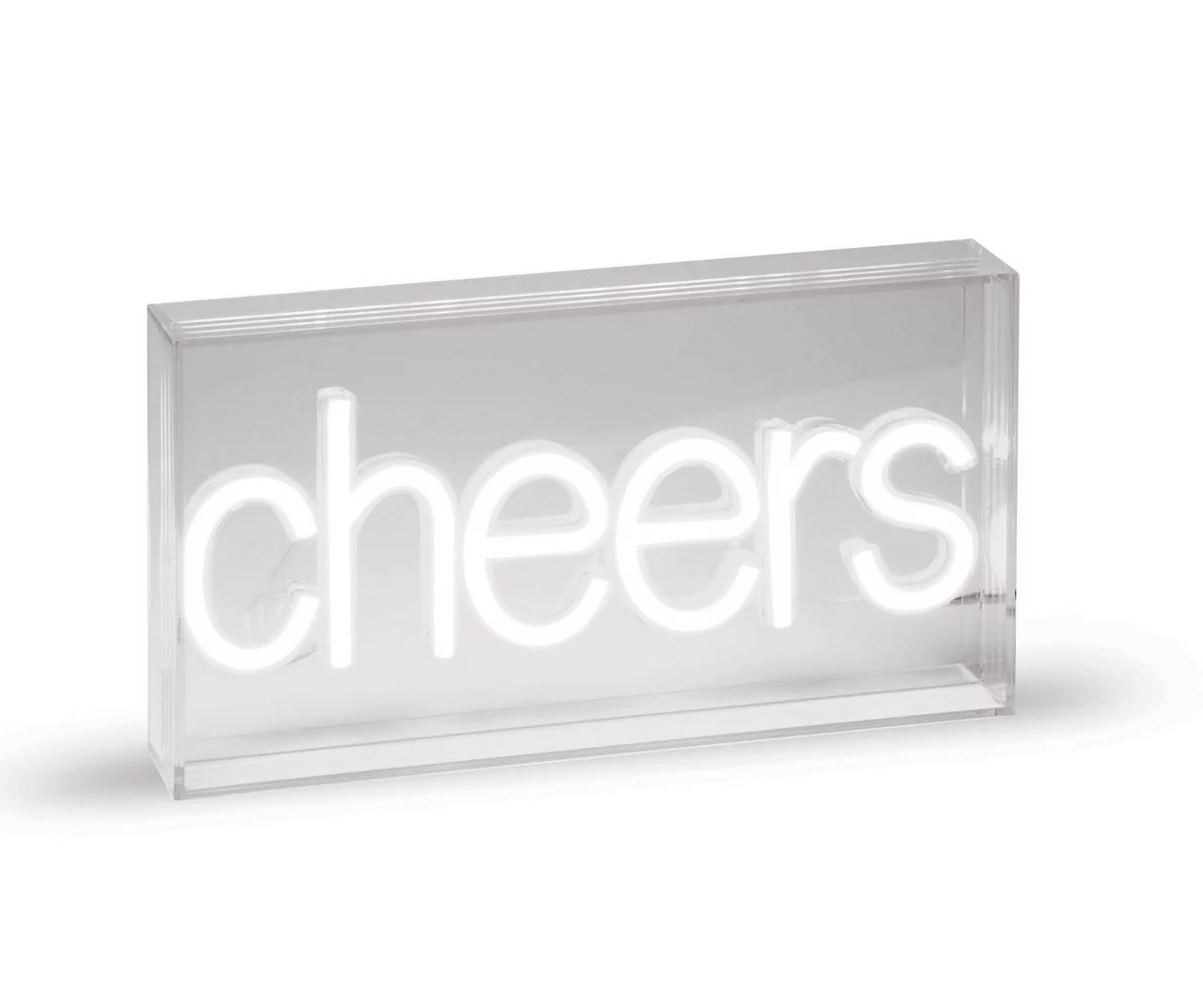 “Cheers”! Send a friendly message throughout your home with this charming neon-style sign. The word “Cheers” is illuminated by white LED lighting on a clear acrylic sign. This piece is a welcomed addition to a living space, dining space or near a bar.