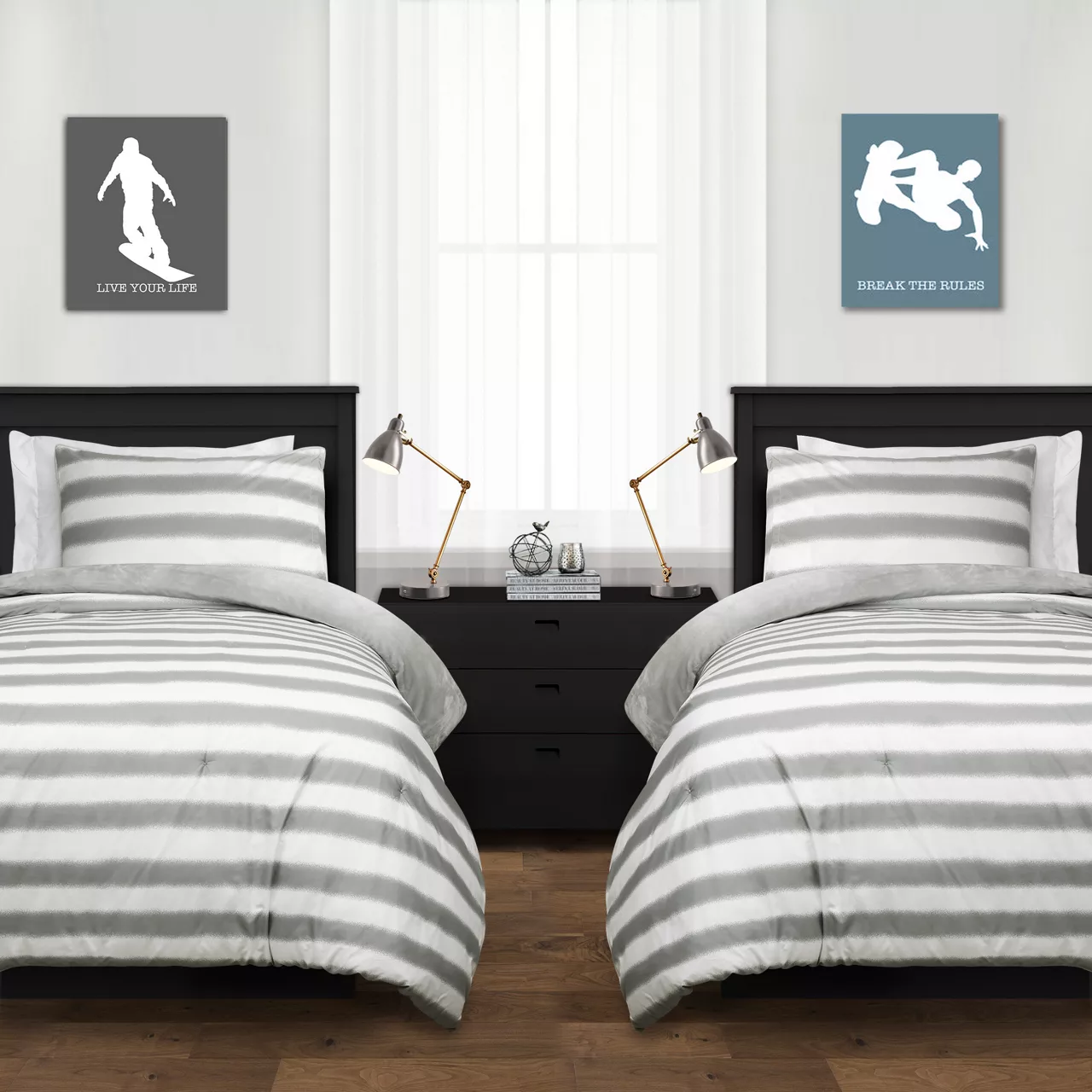 - Comforter features a solid hue on one side and striped accent on the other