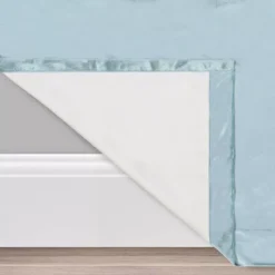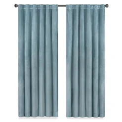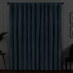 Find the perfect combination of fashion and function with the Eclipse Harper window curtain. This beautiful panel offers Absolute Zero 100% blackout benefits with a premium thermal lining that gives a rich handfeel and provides luxurious drapability. It features solid velvet fabric in blue, which makes it versatile and perfect for the bedroom, living room, dining room or office and allows you to enjoy all of the light-blocking, noise-reducing and energy-saving benefits. Reverse of panel is light gray.