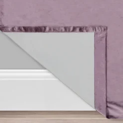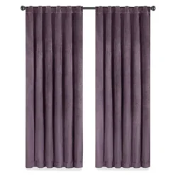 Find the perfect combination of fashion and function with the Eclipse Harper window curtain. This beautiful panel offers Absolute Zero 100% blackout benefits with a premium thermal lining that gives a rich handfeel and provides luxurious drapability. It features solid velvet fabric in purple, which makes it versatile and perfect for the bedroom, living room, dining room or office and allows you to enjoy all of the light-blocking, noise-reducing and energy-saving benefits. Reverse of panel is light gray.