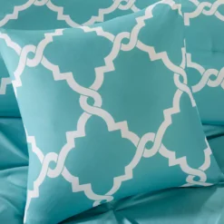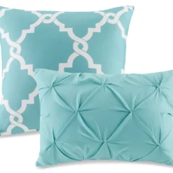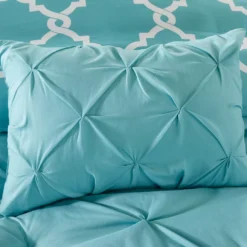 The Hayden comforter set gives you the option to dress up your room depending on your mood! One side features an aqua tufted look while the reverse is an aqua and white printed fretwork design. Shams are fully reversible as well and two decorative pillows feature solid fabric manipulation and printing to match back to both options.
