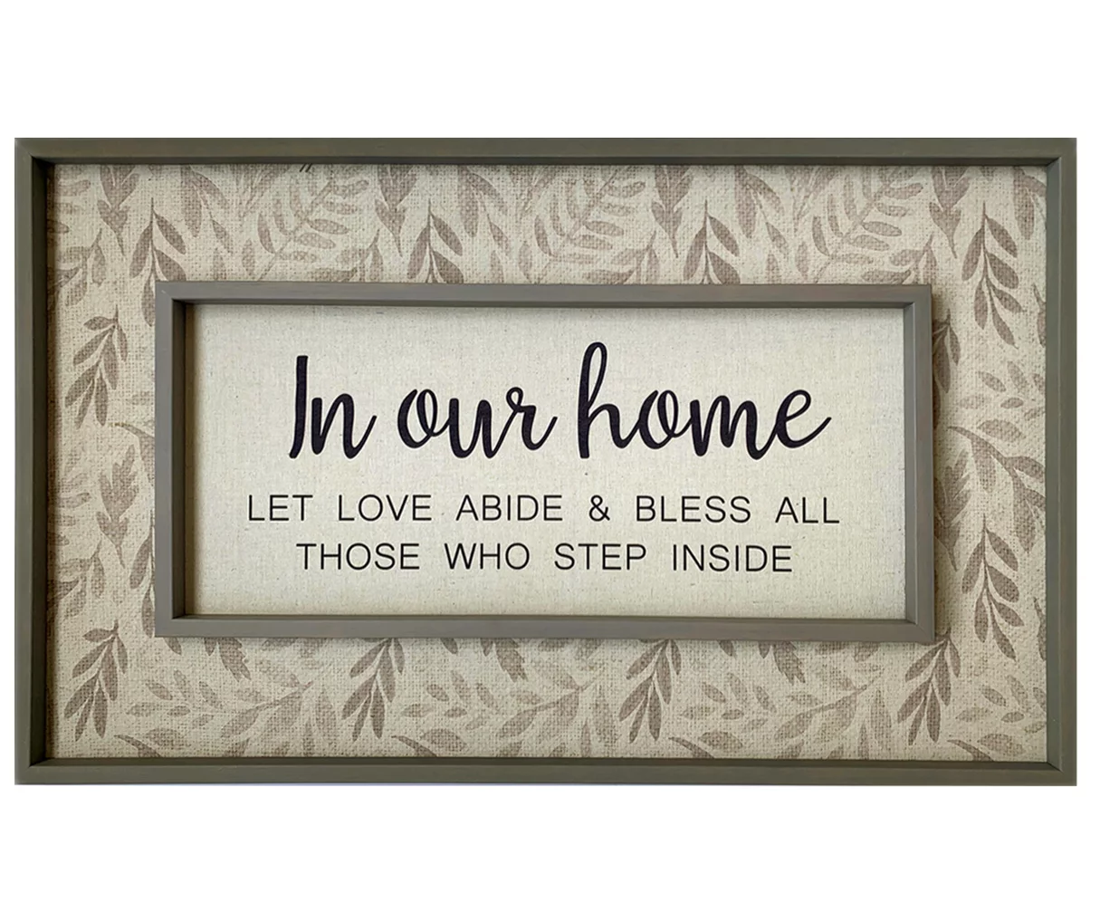 Share warm and welcoming words with friends, family and guests when you add this charming decorative plaque to your walls. It features a sweet message surrounded by a leafy pattern and linen fabric texturing. A wooden border trims the outer and inner sections for dimensional, rustic flair.