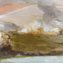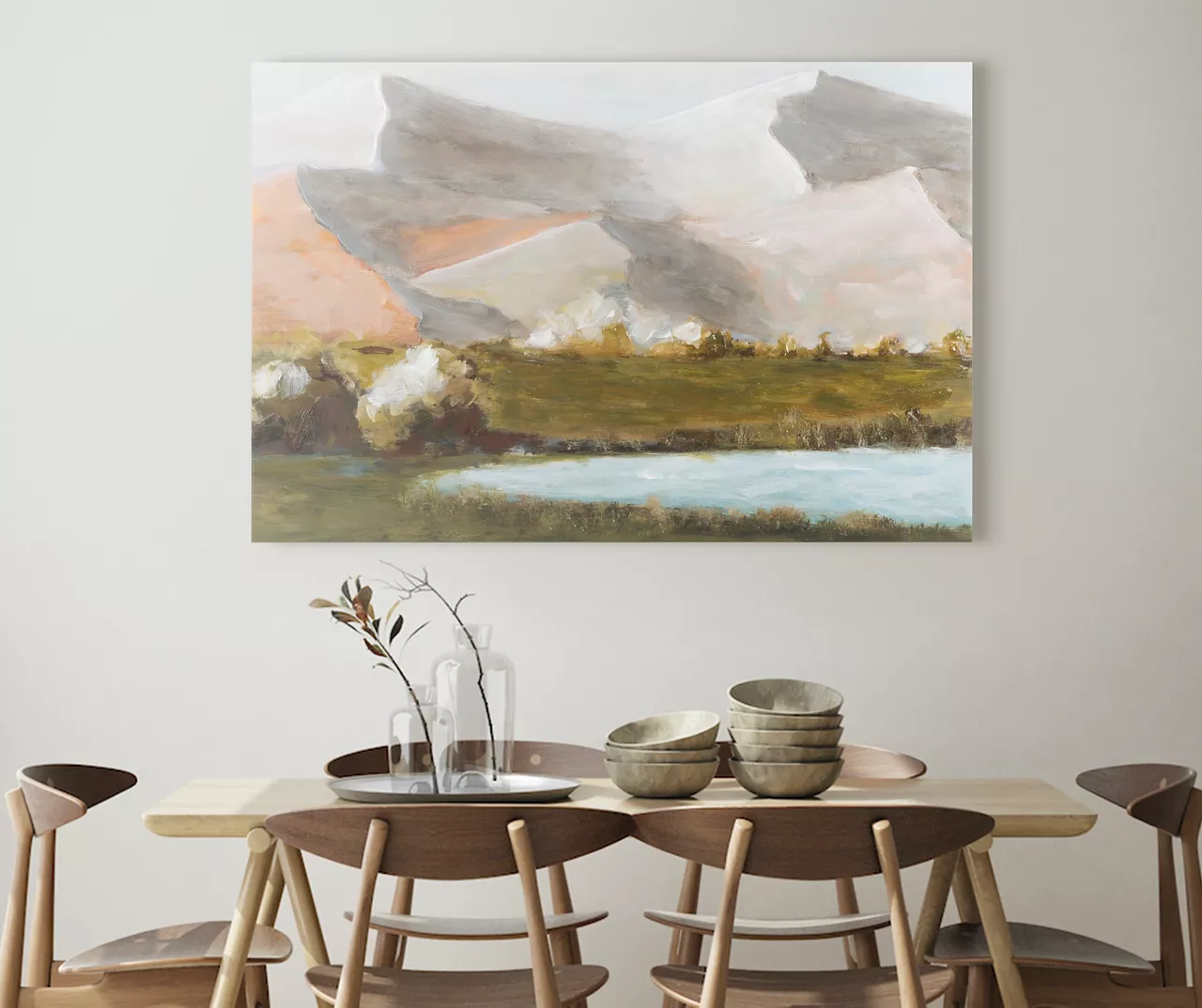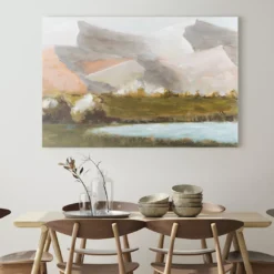 A painted mountain scene is shaped by gentle strokes in subtle shades of peach, blue and other earthen hues on gallery-wrapped canvas for a creative note of nature in your home. Gouache-style texturing adds a dimensional visual element that makes this pretty pick pop wherever you choose to place it.