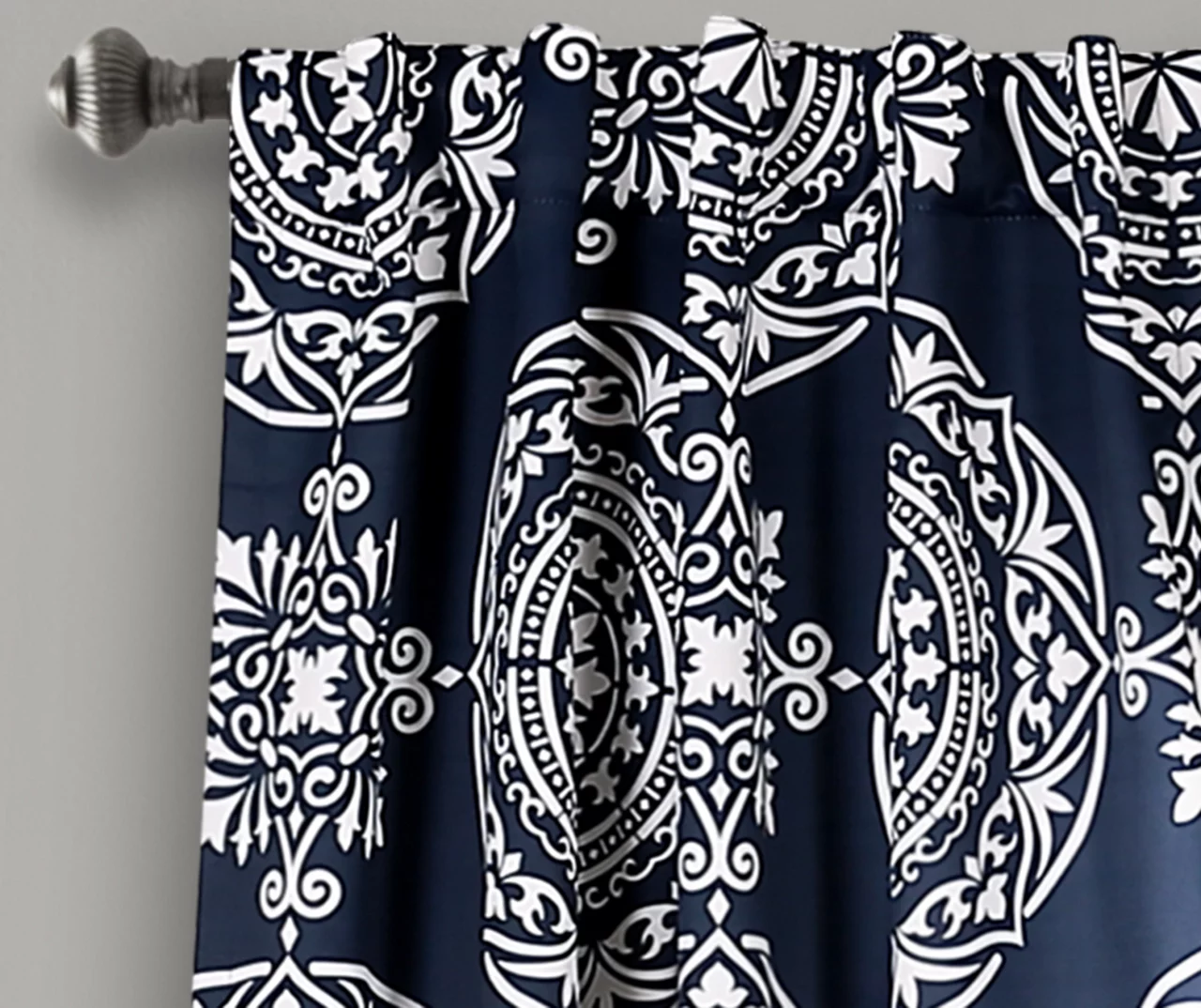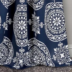 - Navy blue and white combine in an elegant allover medallion print
