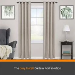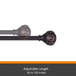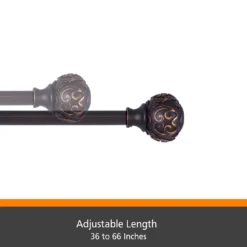 - 5/8″ diameter curtain rod in oil rubbed bronze adjusts from 36-66″ and projects 3″ from the wall