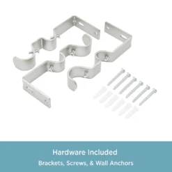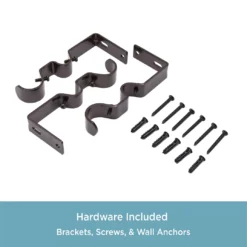 - Includes 1 telescoping double curtain rod with finials, 2 mounting brackets, 1 center support, screws, drywall anchors and installation instructions