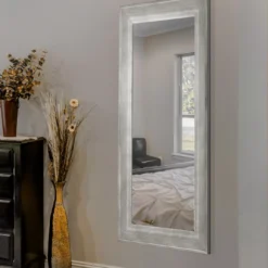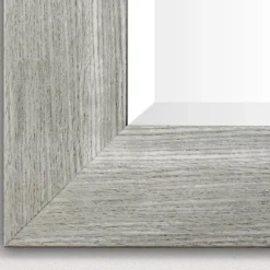 This wall mirror is enclosed in a rectangular frame featuring a white wood grain look with warm gray undertones. The mirror edges are beveled, giving an additional touch of sophistication to the rustic aesthetic. This functional and decorative mirror can serve as the visual focus at the end of a hall, or the centerpiece of a living room gallery wall. Hang this gorgeous mirror above or behind a dresser, vanity or other furniture to enhance with rustic yet airy design.